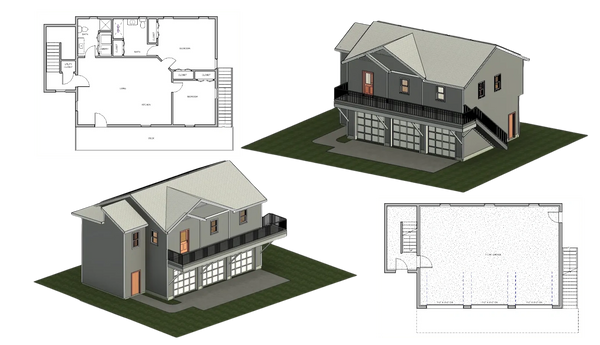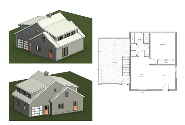 One bedroom ADU on the ground level along side a one car garage with storage above. The main house on the property is 1,400 SF and the ADU is 50% of the main structure or 658 SF.